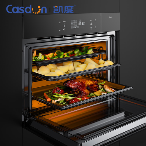 采用五维的模式,使食物上色均匀的同时升温也快,能够大限度达到我们的要求。56L的容量,可满足多人使用,多种食物一起烹饪。