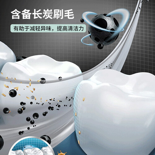 采用高密度刷毛设计,与牙齿接触面大,提升清洁效果。刷毛中含有备长炭微粒成分,可以吸附口腔异味,清新口气。