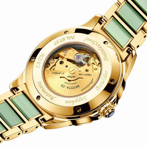 表圈大面积采用了天然的和田玉材质,触感温润细腻,彰显出国风的复古格调。独特荧光粉覆盖指针,深夜清晰读时。