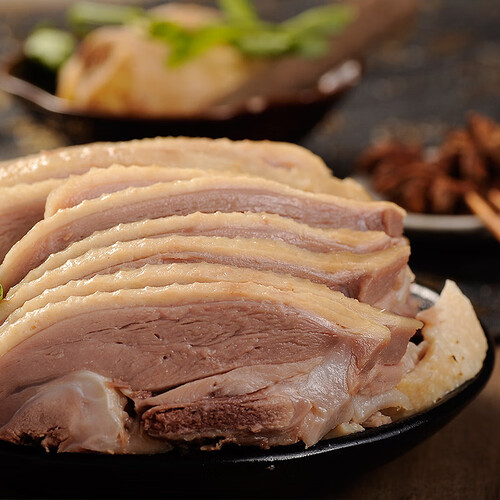 采用切片的南京盐水鸭,肉质饱满、鲜嫩可口。以甜咸结合的秘制酱料调味,味醇汁浓,酱香更入味。