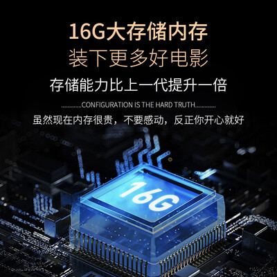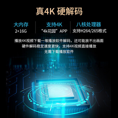 使用硬件解码,速度更快更稳定,支持4K视频直接播放,无需下载播放软件。采用16G大内存,海量应用可随意下载。