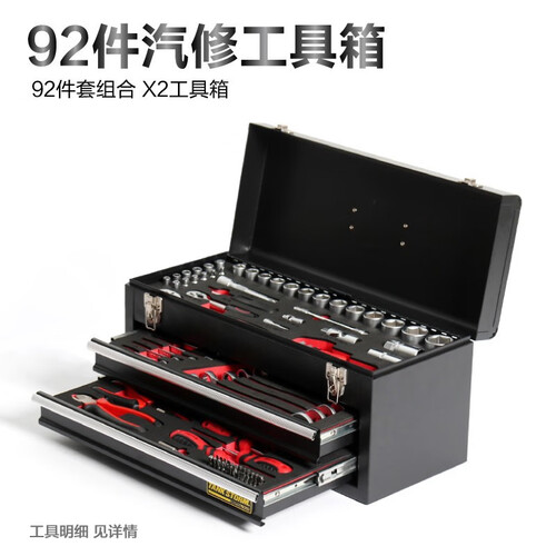 92件工具组套CR-V铬钒钢锻造,手提箱携带方便,72齿密集齿轮,转动只需5度,适合狭小空间作业。