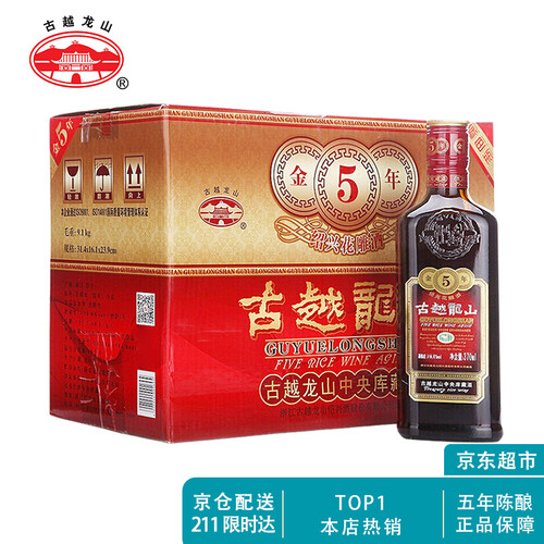 古越龙山金五年绍兴花雕酒,纯粮食原料酿制,历经五年陈酿,陈香十足。酒精度数低,畅饮不易醉,适合爱喝酒的长辈饮用。