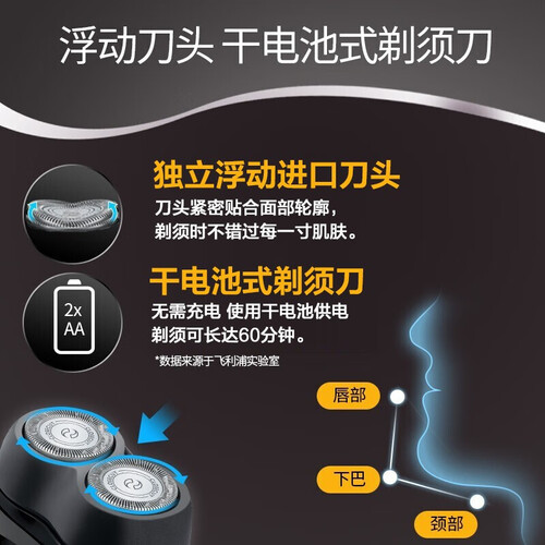 干电池供电,无需充电便可享受便捷剃须,出差旅行必备。人体工学设计,贴合手掌持握,握感舒适。