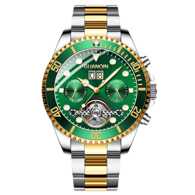 绿色圆形表盘结合几何图形刻度,朝气蓬勃,富有活力,装点男士腕间魅力。采用高清HD夜光配置,暗黑夜晚也能轻松读时。