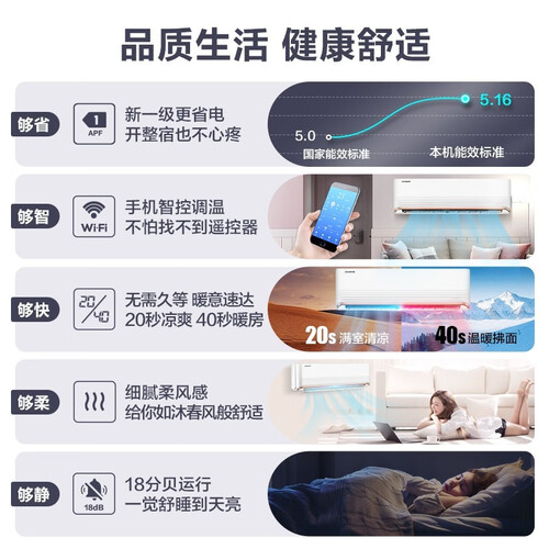 拥有上下左右大角度送风功能,全屋制冷制热更均匀。搭载直流压缩机,运行稳定,可有效降低噪音,不易打扰睡眠。