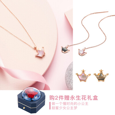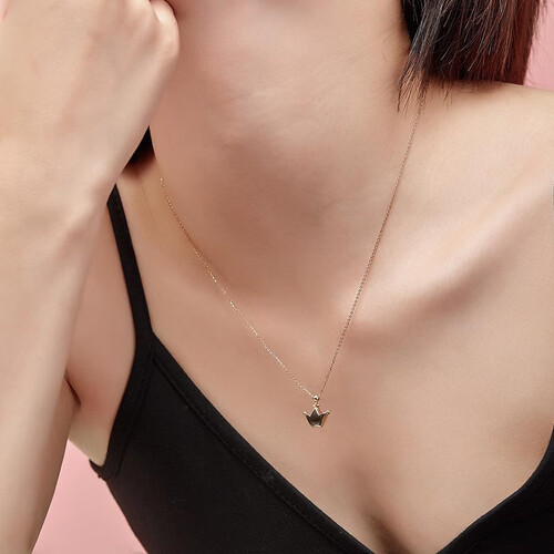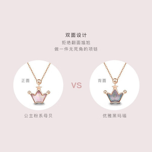 玫瑰金项链采用皇冠造型设计,点缀星星元素和圆珠,采用双面设计,正面是粉色母贝,背面是五彩斑斓的黑,无惧翻面,佩戴更舒心。