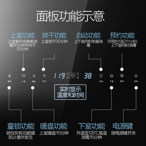 一键预约,到点自动开启消毒功能,省心更便捷;童锁功能,有效防止孩童好奇打开门体而不慎摔坏碗碟,让妈妈们更放心。