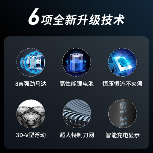 配备智能充电显示设计,便于随时查看电量,更具实用性。搭载大功率强劲马达,可以提供充足的动力,剃须速度快。
