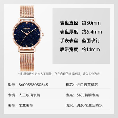 纤薄表身,薄至6.5mm,甩脱厚重感,轻巧出行。防水设计,安心佩戴享受舒适生活。抗刮划蓝宝石表镜,看时清晰,耐磨性好。