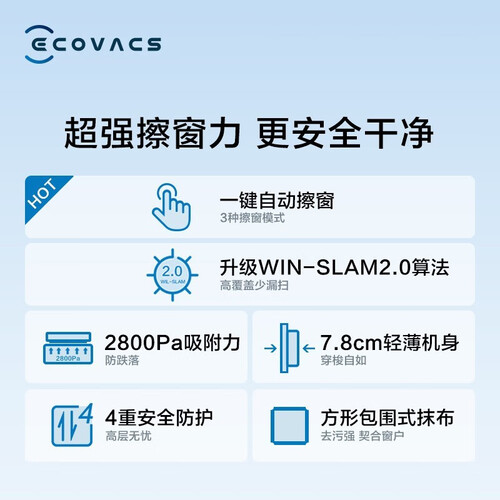 真空度吸附性能好,安心擦窗少忧虑。方形机身覆盖范围大,清洁彻底不留死角。搭配大容量备用电池,待机更持久。