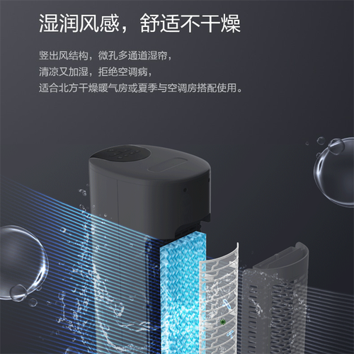 竖出风结构,搭配微孔多通道湿帘,能够加湿空气,缓解屋内干燥闷热感。塔式全风道系统,快速出风范围广,无需长久等待。
