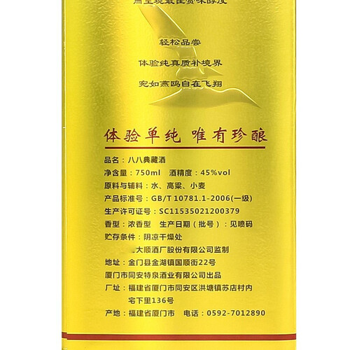 采用的是清澈的用水以及饱满的高粱,小麦等纯粮食酿造而成,酒香四溢,久久不能散去。瓶身整体黄金色,奢华耀眼,送礼佳选。