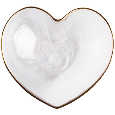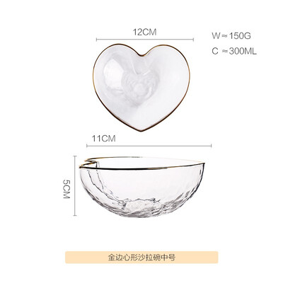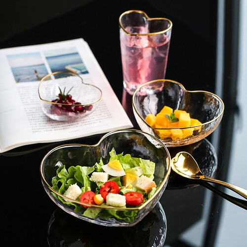 这款玻璃碗采用了透明材质制作,搭配日式的金边点缀,带有小资的高级感。配以甜美可爱的心形轮廓,可用于装水果等食材。