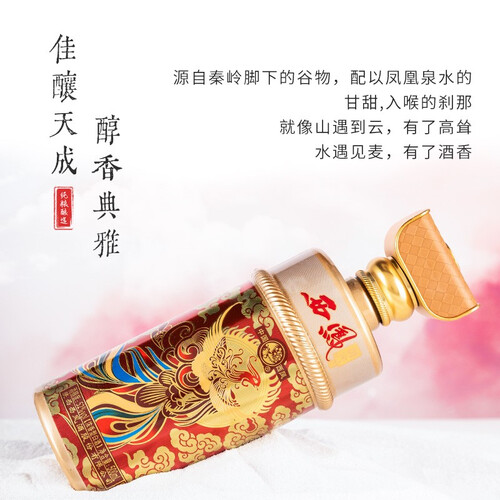 喜庆的酒瓶包装,显得更加的大气,适宜喜宴等场合饮用。采用固态酿造的工艺进行生产,保证酒体的香味更加的浓郁。