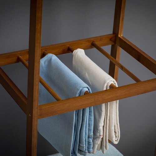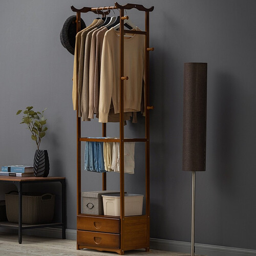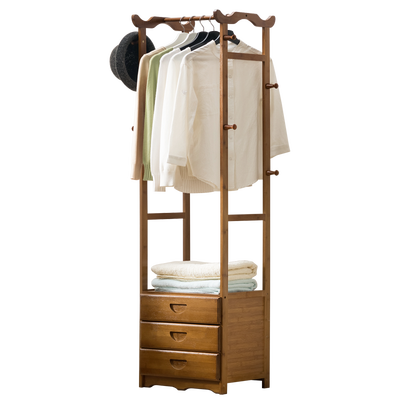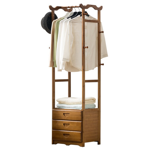 上层设计牢固的木架可以用来挂置衣物,下层设计抽屉方便储存物品,放在家中更加实用,增大储物空间,使家中更加整洁干净。