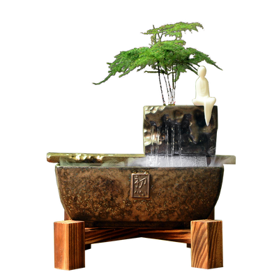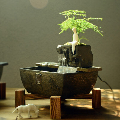 就如同山水画一般,悬崖峭壁上屹立着树木,源源不断的喷泉流水倾流而下,一个小人儿在思考;充满着禅意,引人深思。