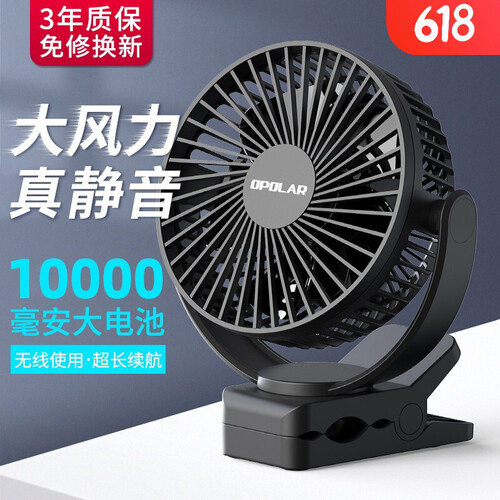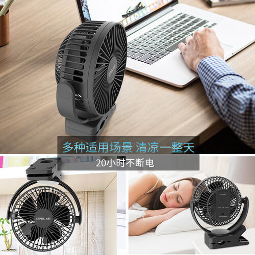 5000毫安超大容量内置电池,4小时充满,可无线续航20小时,再也不用到处找充电板。360°任意旋转调节,带来凉爽体验。