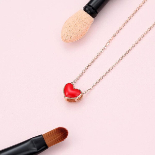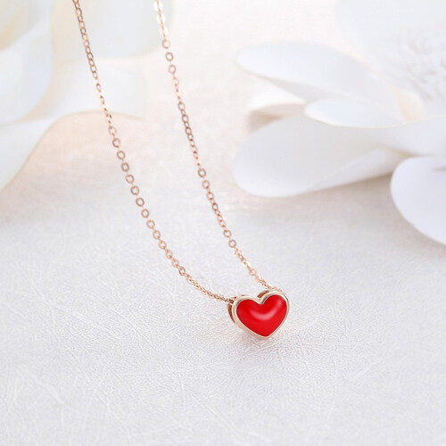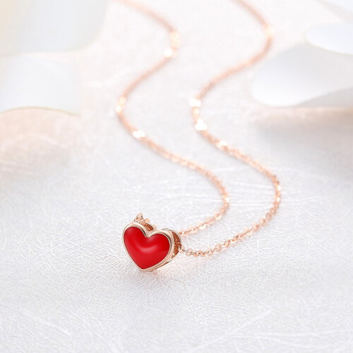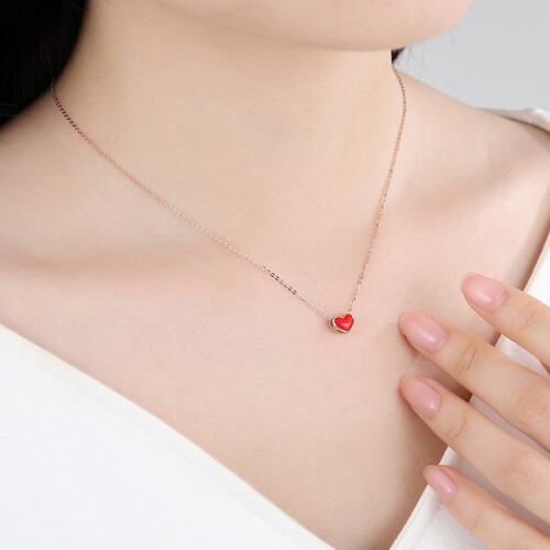 鲜亮小红心,18K金纤细链条,勾勒出锁骨和颈部曲线,加上红色小爱心吊坠,打破设计单调感。显白的珊瑚红将肌肤衬托的更白皙。