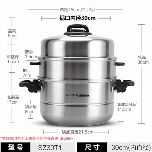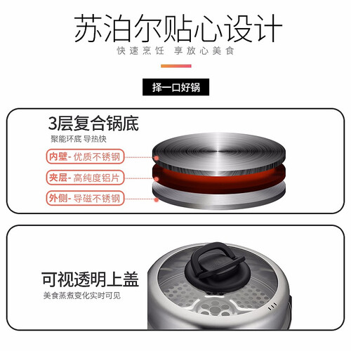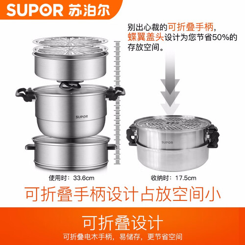 手柄采用可折叠设计,便于存放,不会占用太多空间。锅底采用三层复合底设计,能够做到均匀加热。