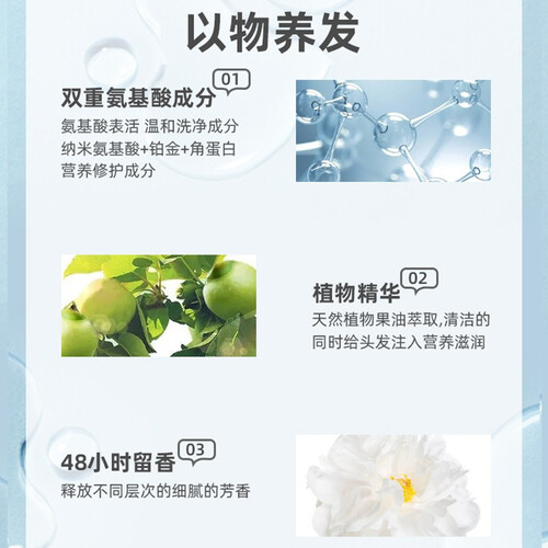 以植物性原料加入丰富蛋白的牛乳,让头皮毛囊更健康,从而改善发质。奶油般细腻的泡沫,让养分直达发芯,细腻呵护。