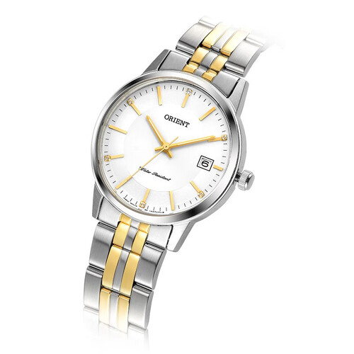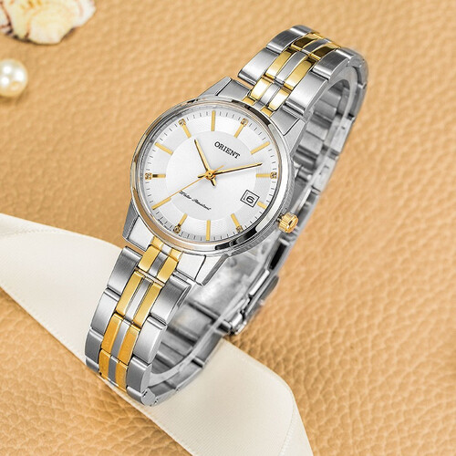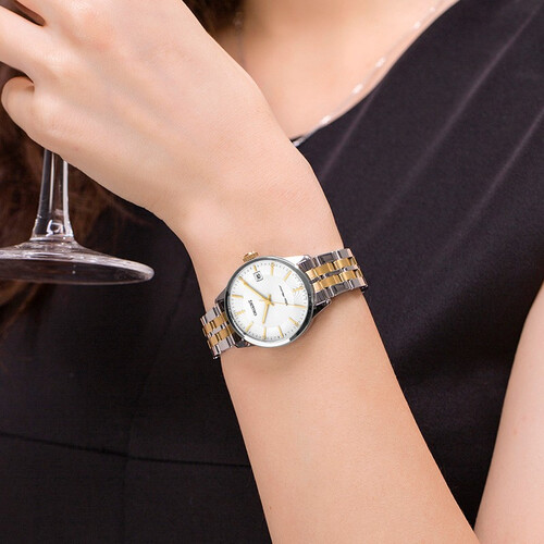 这款手表采用了矿物质玻璃镜面,透光性好且耐磨耐划。不锈钢表带配上高贵的间金色,石英机芯,让腕间更加精彩。