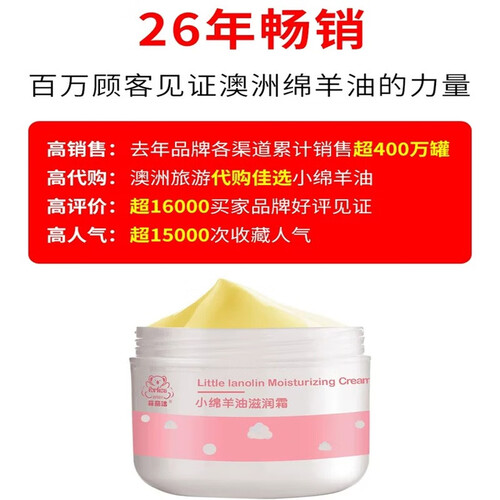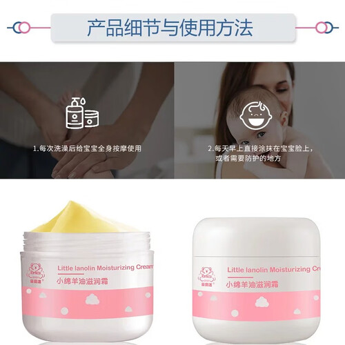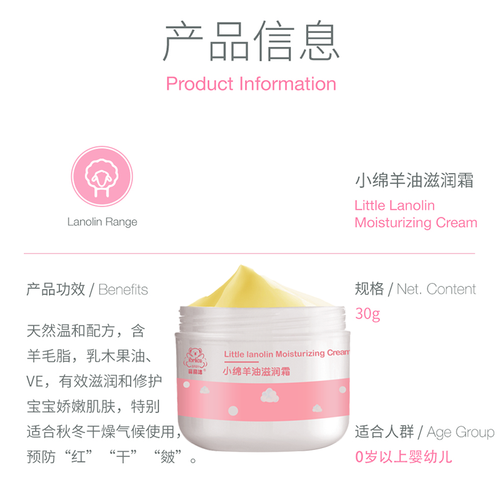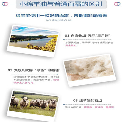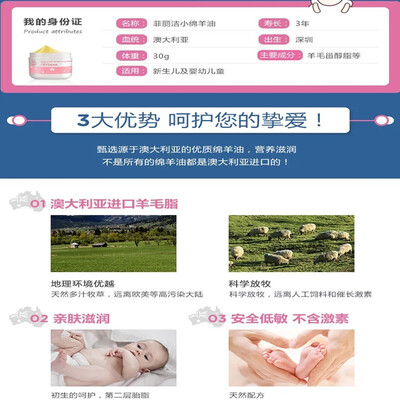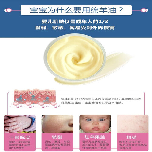 澳大利亚进口羊毛脂提炼,配方天然,更易被人体吸收。质地绵软,深层滋润干燥肌肤。一瓶在手,妈妈很安心!
