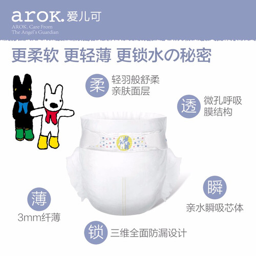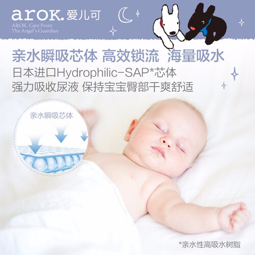 3D悬浮芯体,全方位吸收尿量,瞬间锁水,让小屁屁干爽自如。