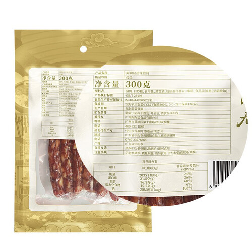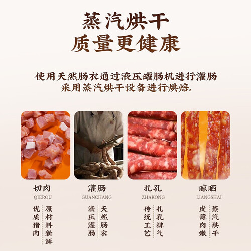 纯猪肉制作的腊肠,肉质新鲜又紧实,带来美味鲜香的口感。三分肥七分瘦的腊肠,散发经典广式风味,刺激着味蕾。