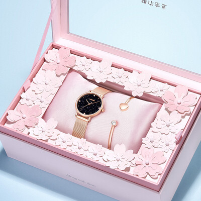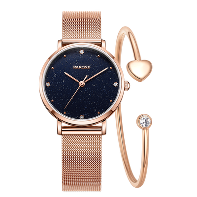 璀璨蓝砂石表盘,让你仿佛置身于浪漫星空之中,可在女神节送给爱人表达心意。配赠锆石手镯,穿着搭配更出众。