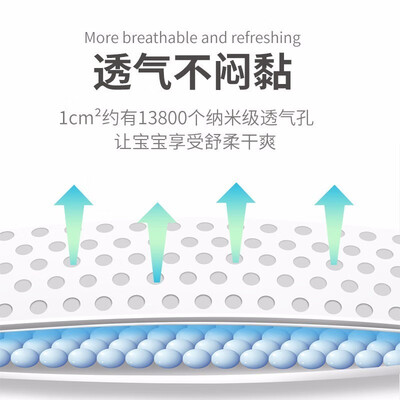 全新智能高分子复合吸收芯体,快速吸收尿液,干爽透气,不起团、不断层。采用柔软透气底膜,及时排出闷湿气,减少宝宝红屁屁。