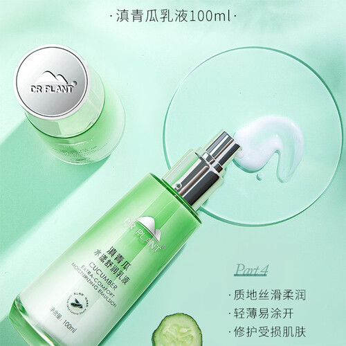 青瓜凝露质地清透,上脸清爽吸收快,能够深层调理肌肤,注入慢慢的水分。青瓜乳液进一步保湿,还能修护受损肌肤。