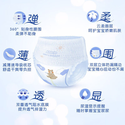 柔软的腰围设计具有很高的弹力,方便拉伸因此宝宝穿着更舒适。强吸收芯体可以快速锁住尿液,带来一整天的清爽感。