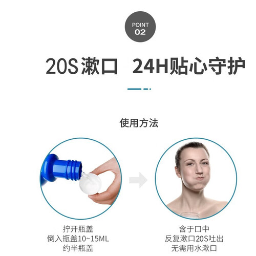 薄荷口味,清凉舒爽,能有效出去口腔异味。漱口水采用自然温和配方制作,不添加酒精无刺激,使用更安全舒适。