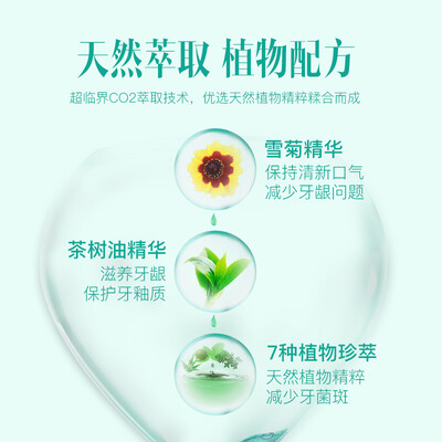 含茶树油精华成分,有效抑制牙菌斑产生。还含生雪菊成分,持久的清新口气,形成清爽口感,整个人焕发活力。