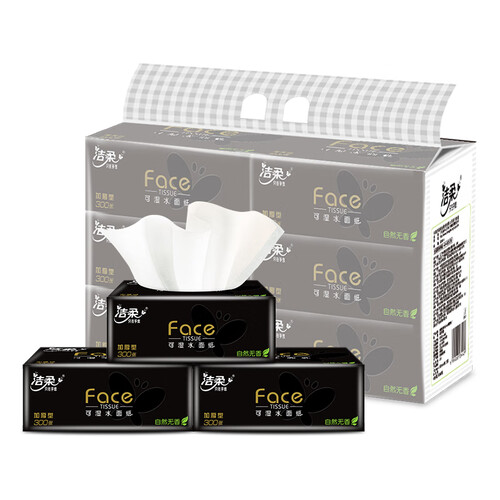 纸巾湿水后不易破,可蘸湿使用,轻松解决多种污渍问题。经典的黑色外包装,时尚大气,衬得抽纸品质更高档。