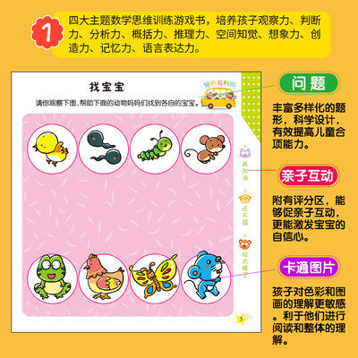 问题、卡通图片与亲子互动模块相结合,帮助孩子锻炼思维能力。题型丰富多样,经过科学搭配,有助于孩子各项能力的培养。