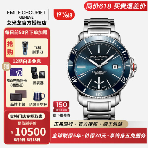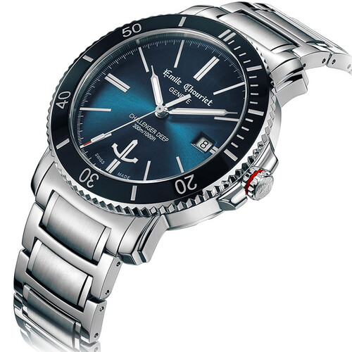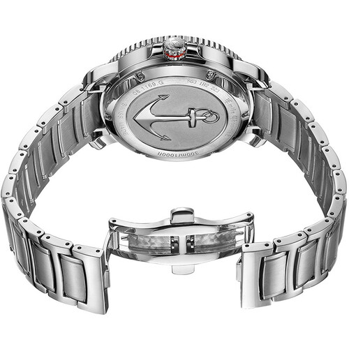 蓝色太阳砂表盘与白色条钉时标的结合,为表身增添层次感,打造不一样的视觉体验;密底后盖雕印船锚标识,立体形象。