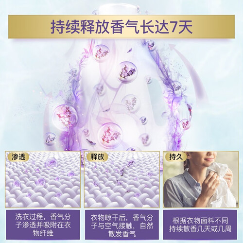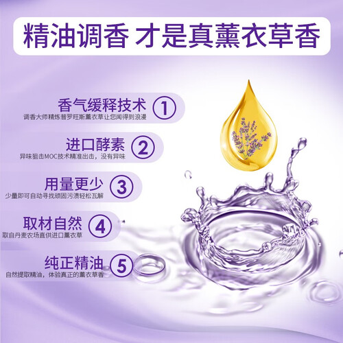 添加天然薰衣草精华,能够使衣物持久留香。蕴含酵素洁净去污成分,能够有效地去除衣物的顽固污渍,让衣物更为干净。