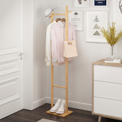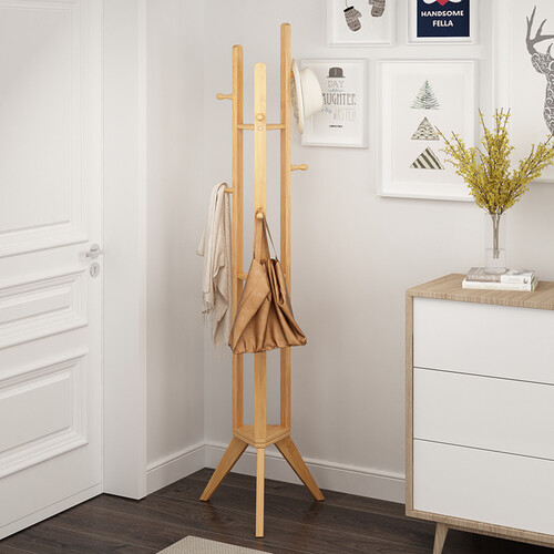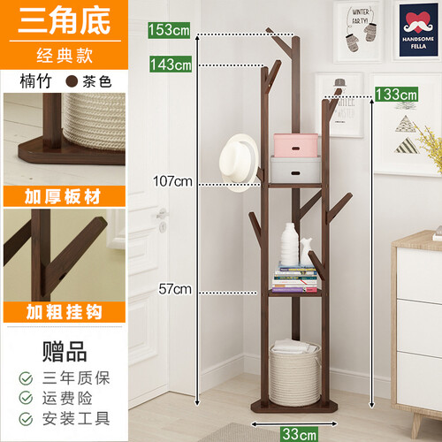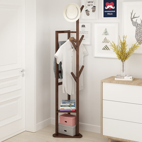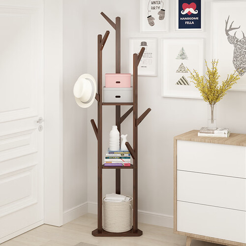 多功能衣帽架设计,挂钩摆放衣服和帽子,多个置物层架增加纳物空间,摆放物品使用更方便。简约的茶色外观,沉稳配色百搭家居。