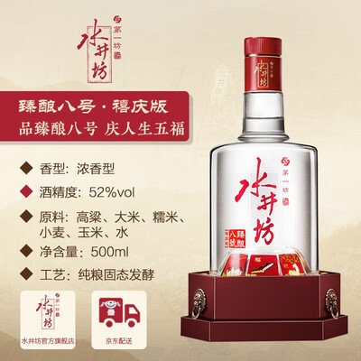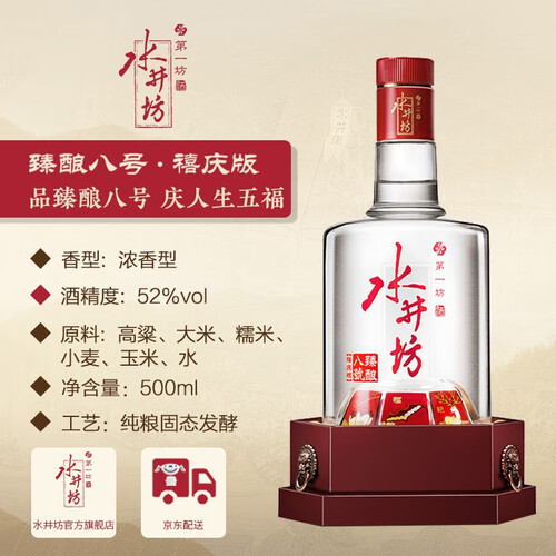 瓶身采用五幅祥瑞图案设计,更加具有庆贺吉祥的意义,适合婚礼喜宴使用;包装比较精美,可以用于赠送亲友。