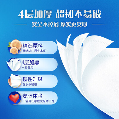 纸巾由四层纸层复合而成,每格都厚实好用,节省了费纸量。采用多层立体吸水技术,能够快速吸净水分,不留水痕。