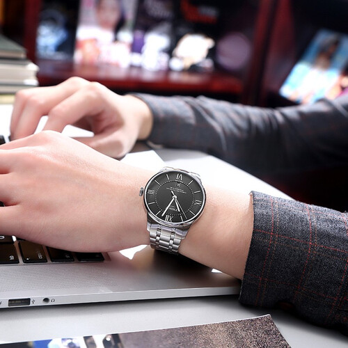 搭载自动机械内芯,运行稳定,时间准确无偏差。经典黑色盘面,加以撞色指针,读时直观明了。