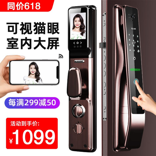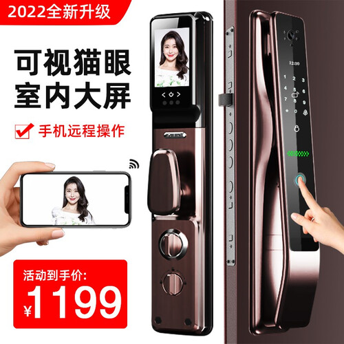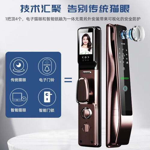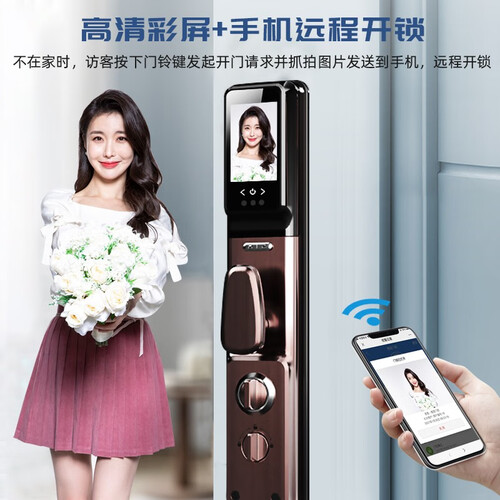 这款电子锁拥有高清的显示屏幕,可以清晰查看门外的状态。搭载智能的芯片,使其识别指纹的效率更高。