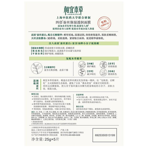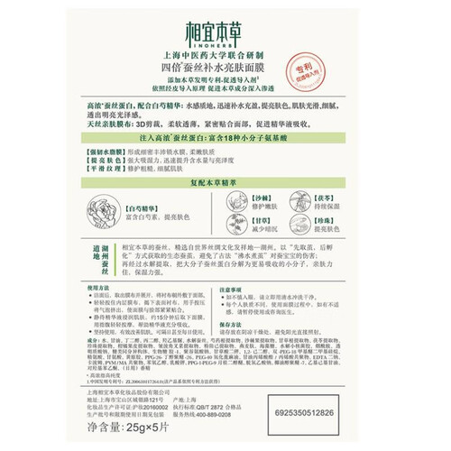 水解蚕丝蛋白,充分补水保湿。多种本草复配,水润加成。专利导入元技术,促进肌肤吸收。15分钟密集补水SPA,敷出水光肌。