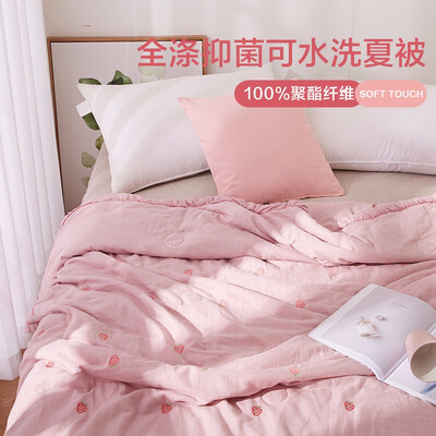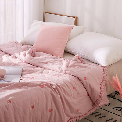 被面刺绣可爱的草莓图案,配色鲜艳,立体逼真,凸显品质感。采用整张纤维填充,布面平整顺滑,不易板结变形。