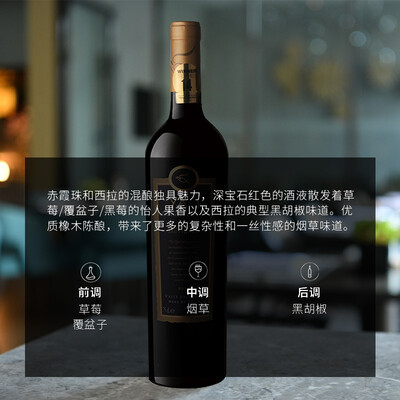 源自优质的核心产区,昼夜温差大,利于糖分积累,酒色深沉。充满浓郁的红色浆果味道,前调还带着微微的百合香,回味持久。