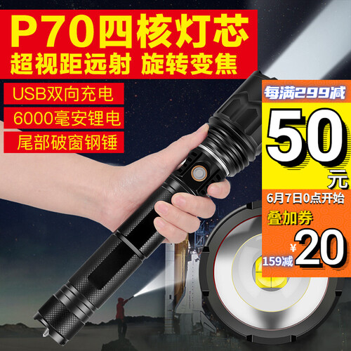 大功率P70四核灯芯,高亮度,可达千米强光远射,视力范围更广阔,媲美车头大灯的强光。可旋转伸缩,便于快速变焦。