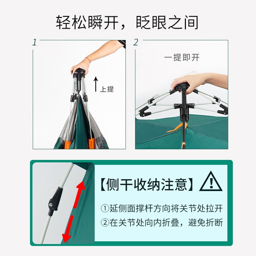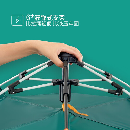 采用液压式弹簧装置,轻提顶部即可开帐;帐篷总计有五个开口,内湾空气对流顺畅;采用防雨面料,有效防止潮气上浮。