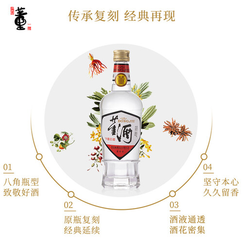 甄选纯粮,辅以130余种本草入曲,采用全手工古法酿造而成,经过大小窖发酵而后分级贮藏。酒液带着舒适百草香,口感醇厚绵柔。